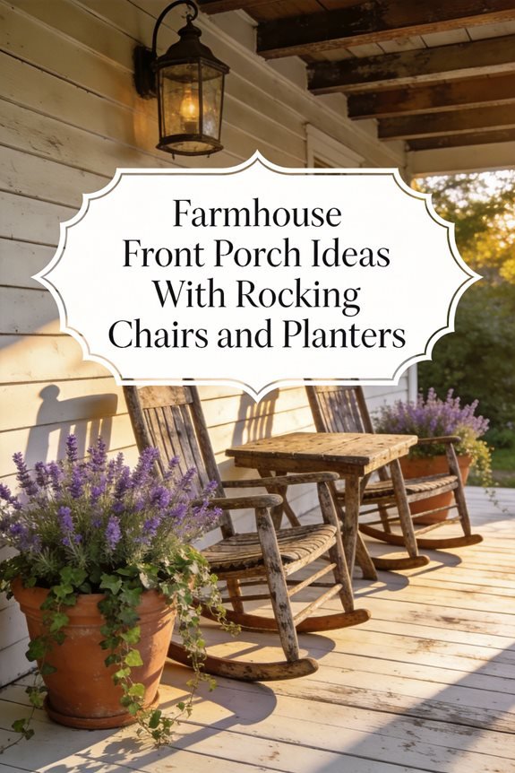 To create a charming farmhouse front porch, start with cozy rocking chairs as your focal point. Opt for durable materials and ergonomic designs for comfort. Surround them with a mix of vibrant planters to enhance the aesthetic. Incorporate cushions for extra coziness, and don’t forget small side tables for convenience. Utilize warm color palettes and decor elements like lanterns for inviting ambiance. This delightful space is perfect for relaxation and gatherings, and there’s much more to discover!